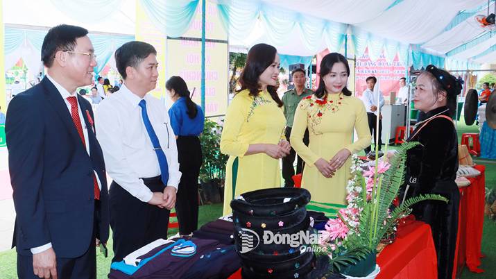 Ủy viên Ban Thường vụ Tỉnh ủy, Bí thư Đảng ủy phường Bình Phước Giang Thị Phương Hạnh cùng các đại biểu tham quan không gian trưng bày sản phẩm đặc trưng của xã Thuận Lợi.