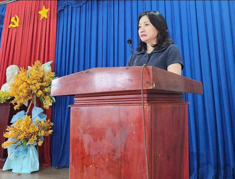 Bí thư Đảng ủy xã - Bùi Thị Minh Thúy phát biểu quán triệt tại buổi gặp mặt cán bộ, CCVC