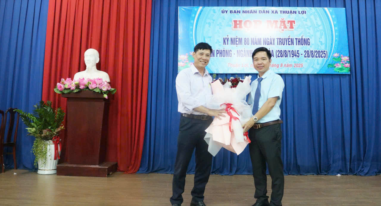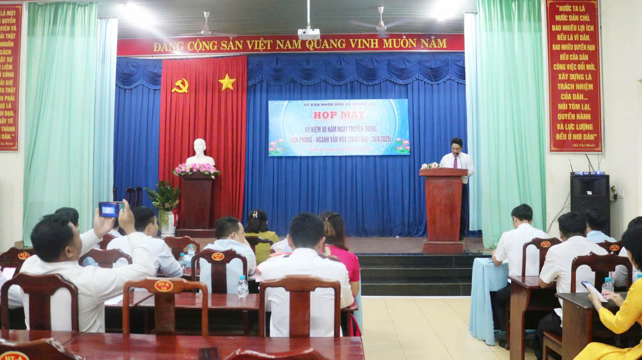 Chiều ngày 28/8/2025, UBND xã Thuận Lợi tổ chức buổi họp mặt nhân ngày truyền thống ngành Văn phòng và Văn hóa 28/8. Dự buổi họp mặt có ông Nguyễn Phong Dản – Phó Chủ tịch UBND xã, lãnh đạo các phòng, ban xã, cùng các cán bộ, công chức Phòng Văn hóa và Văn phòng HĐND-UBND xã.