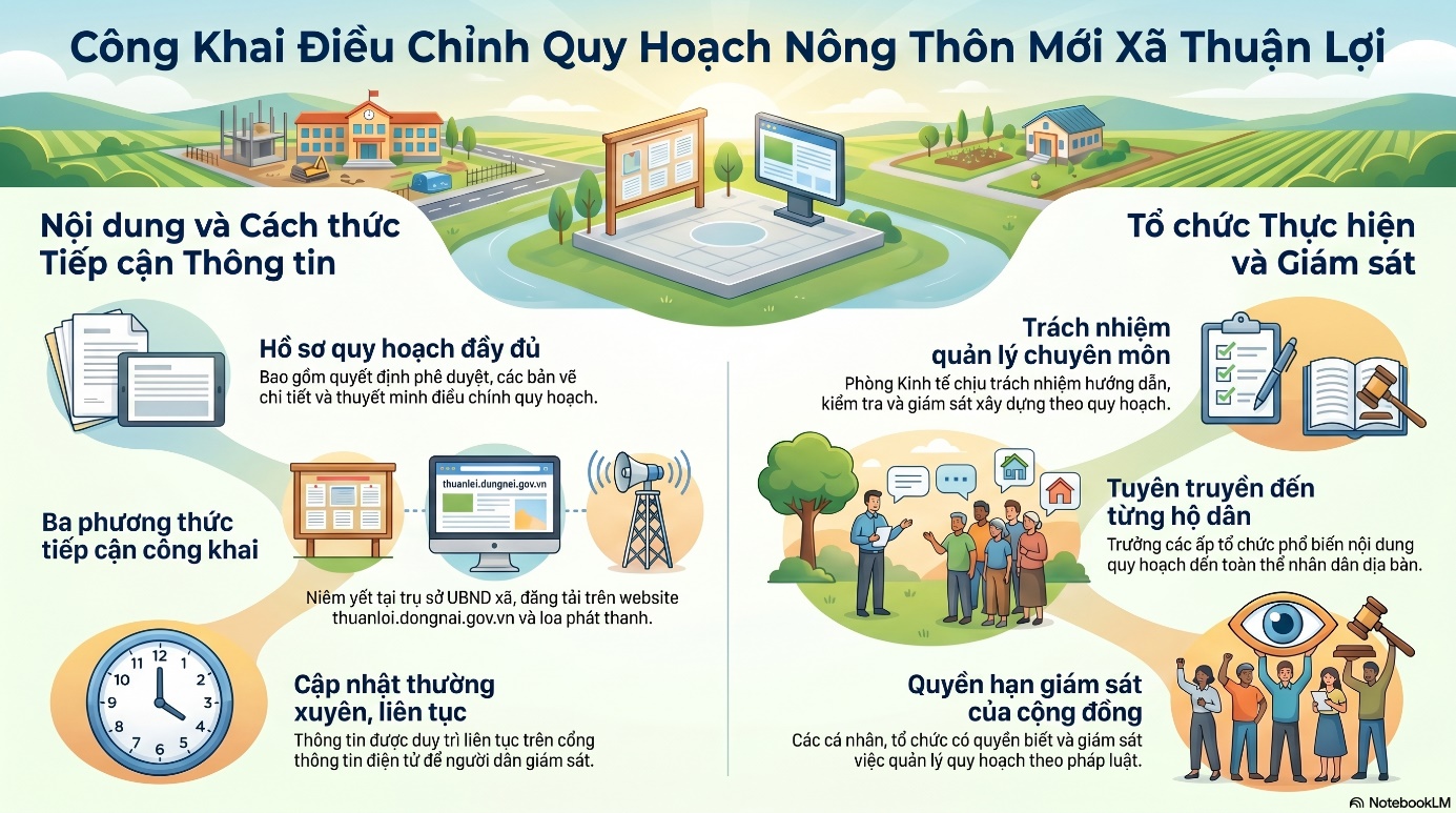 Theo đó, việc công bố, công khai được thực hiện trên cơ sở Quyết định số 305/QĐ-UBND ngày 31/3/2026 của UBND xã Thuận Lợi về phê duyệt điều chỉnh cục bộ quy hoạch nông thôn mới xã Thuận Lợi, huyện Đồng Phú (cũ).
