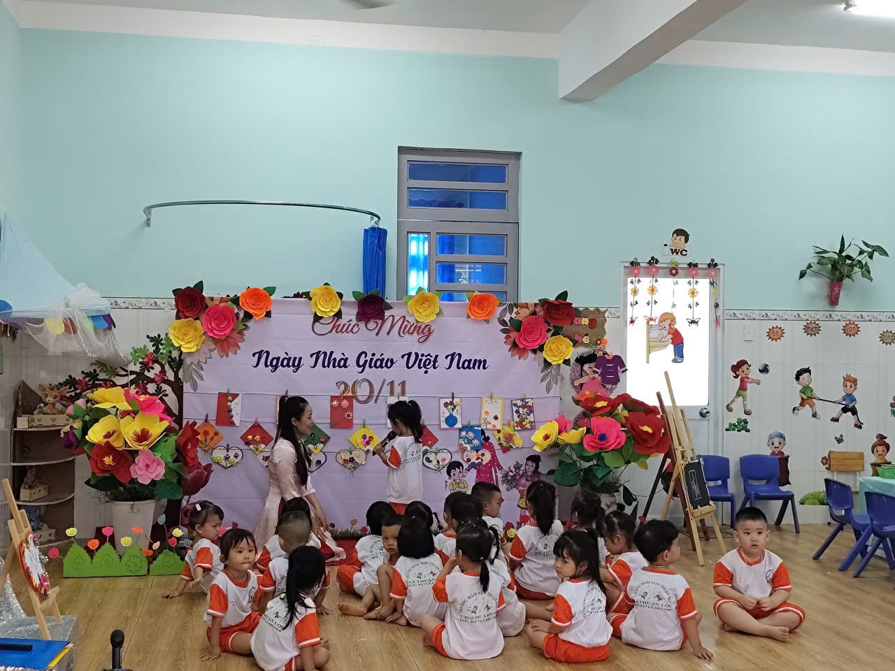 Đối với hoạt động phát triển thể chất, giáo viên tổ chức cho trẻ hoạt động “Bật chụm tách chân qua 5 ô” và trò chơi vận động chuyền hoa, giúp trẻ rèn luyện sự nhanh nhẹn, khéo léo, mạnh dạn và tự tin khi tham gia hoạt động tập thể. Thông qua đó, trẻ không chỉ nâng cao sức khỏe mà còn hình thành tinh thần đoàn kết và kỹ năng phối hợp nhóm. Sau hoạt động vận động, dưới sự hướng dẫn của cô giáo, các bé được tự tay trang trí những tấm thiệp, cắm hoa, gói quà và sáng tạo nhiều sản phẩm nhỏ xinh để gửi tặng thầy cô. Các hoạt động này giúp trẻ phát triển khả năng thẩm mỹ, óc sáng tạo, sự tỉ mỉ và kỹ năng sử dụng đôi tay. Đồng thời, đây cũng là dịp để trẻ bày tỏ tình cảm, lòng biết ơn đối với các cô giáo – những người đang hàng ngày chăm sóc và dạy dỗ mình.